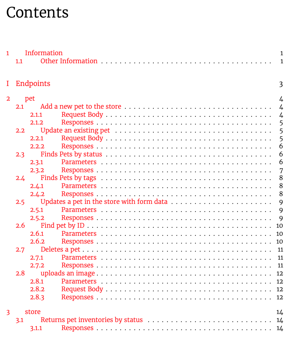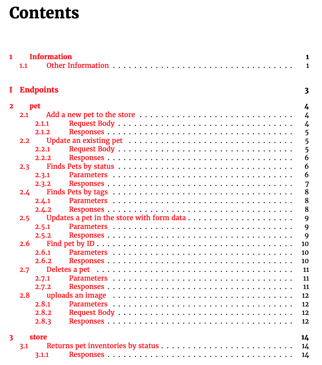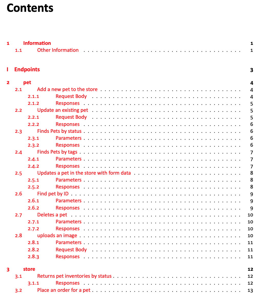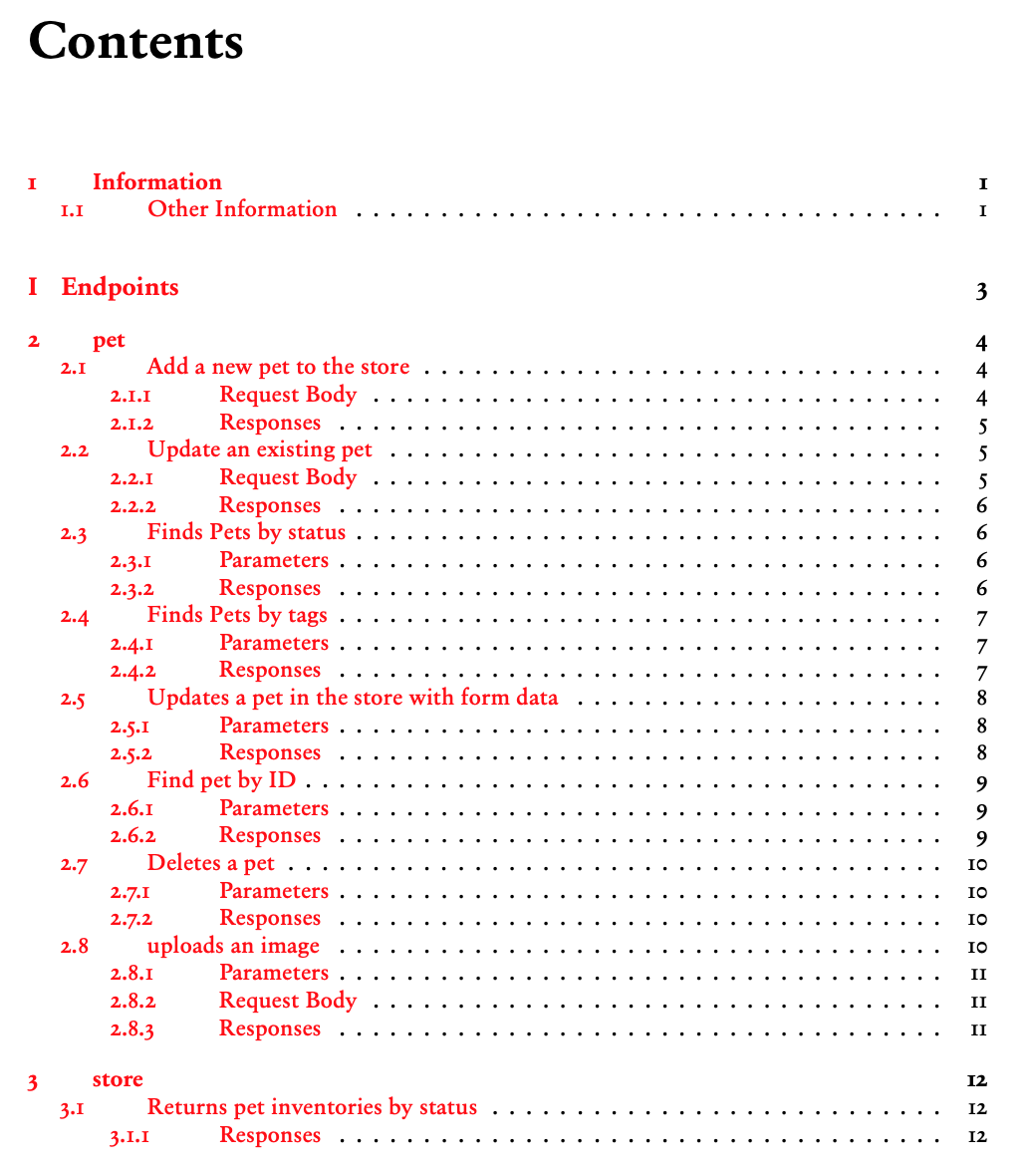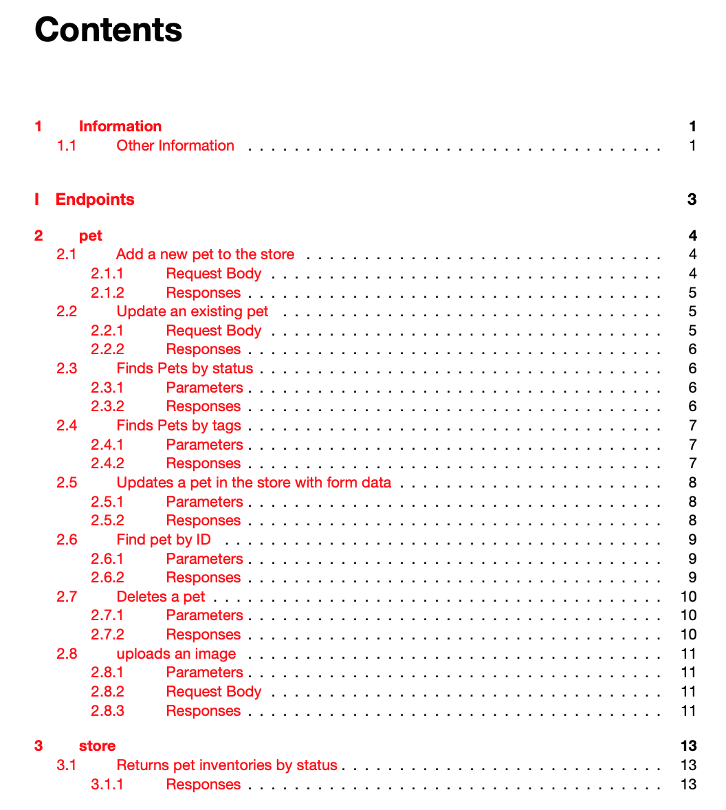 See openapi.pdf for the PDF generated from the official petstore specifications. Note that the petstore sample has a commonmark table in the information, which the embedded converter does not support. This sample was generated using the cmark option.