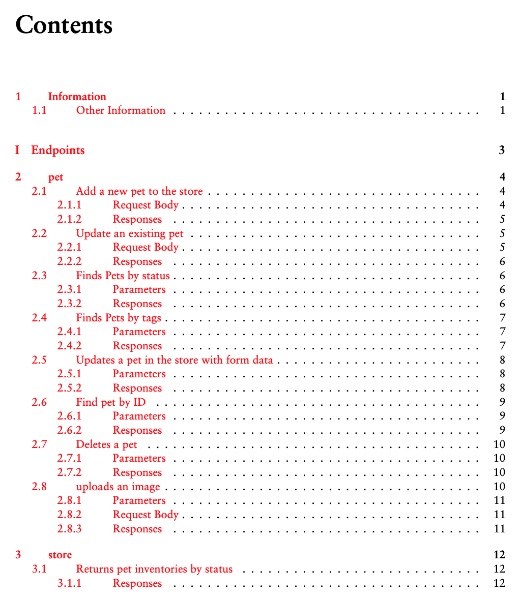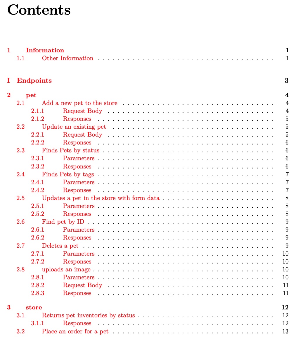 Note: The output openapi.tex includes several other .tex files generated by the process with an \input directive. All file paths are absolute paths, hence the docker mount will need to set up appropriately, or the output moved to an appropriate location for the paths to work on the host machine.
